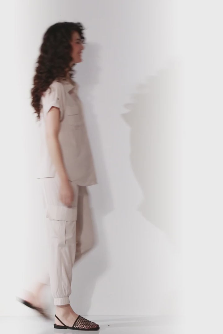 The relaxed-leg design features concealed side pockets and classic cargo pockets on each leg, adding a modern edge.